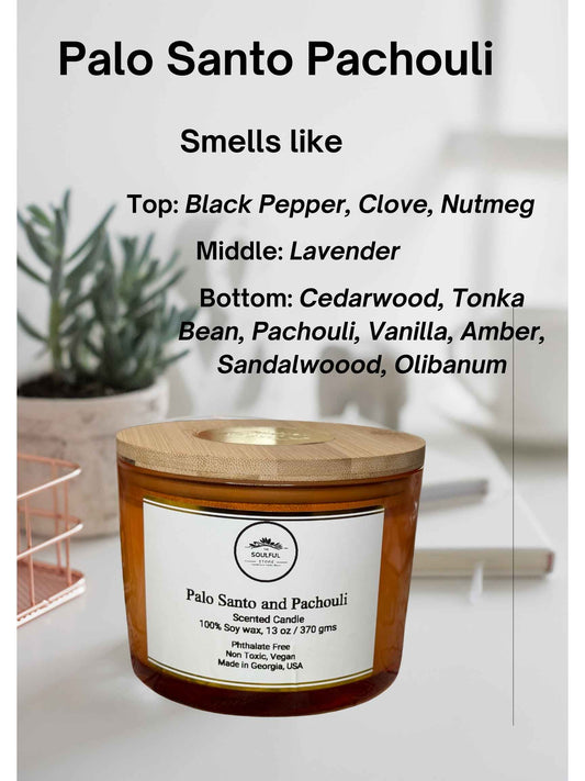 The Soulful Store 13 oz Palo Santo and Pachouli 100% Soy Wax Candle – Phthalate-Free, 100+ Hour Burn, Perfect as Gifts and for Interior Decoration